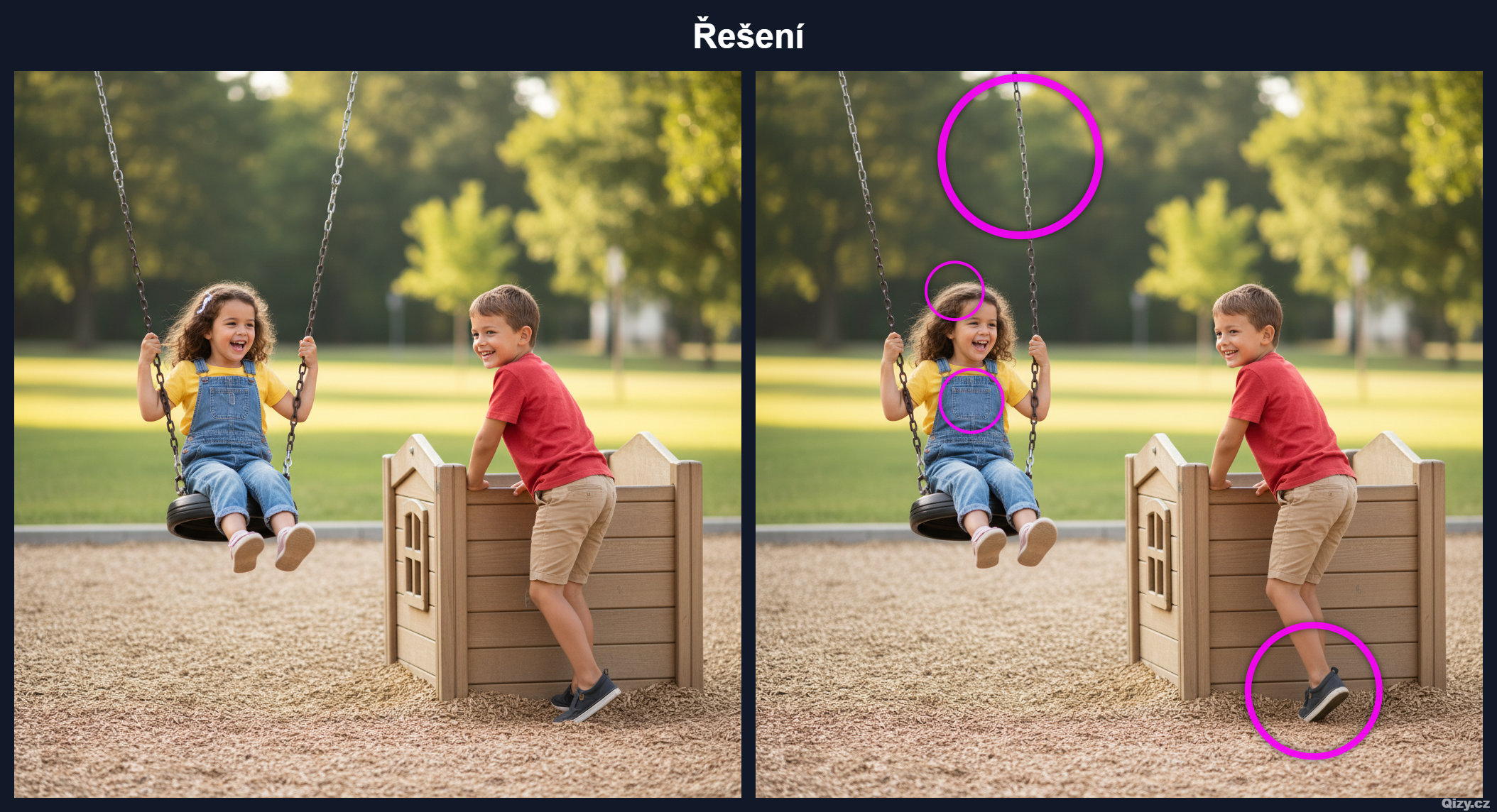 Děti na hřišti: Najdete 4 rozdíly? Porovnejte si oba obrázky a pokuste se najít mezi nimi čtyři rozdíly. Zobrazit řešení Komentáře: Hádanky hádanky hádankanajdi na obrázkunajdi rozdíloptická hádankazrak 70